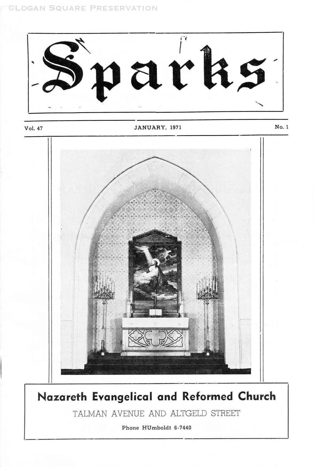 16-pg monthly newsletter with photo of alcove with altar at Nazareth Evangelical and Reformed Church on cover. Contains church news, local business ads, January 1971Collection