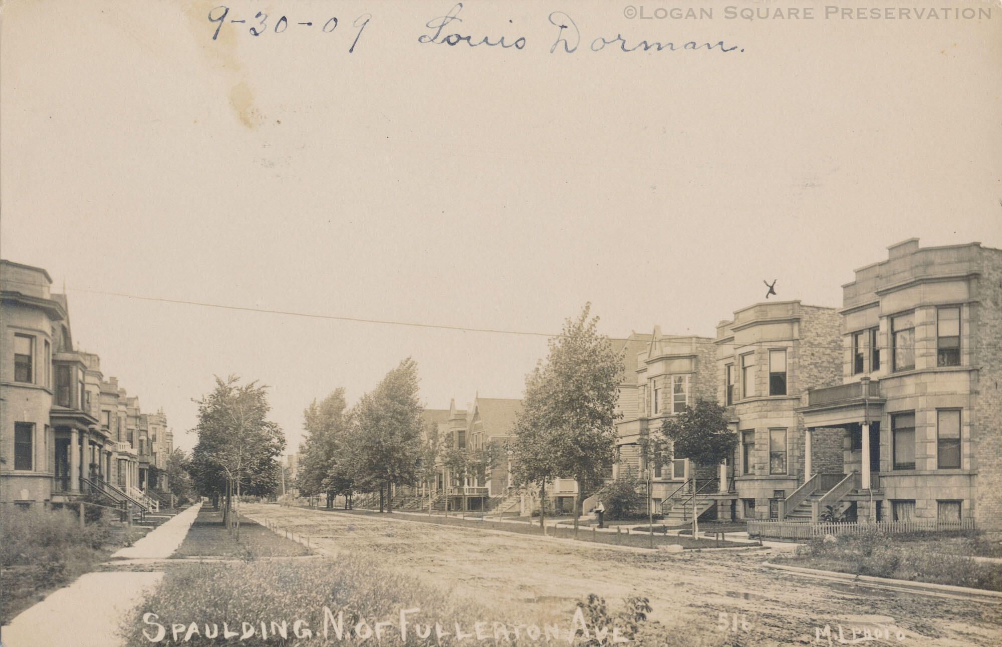 Real-photo postcard view looking north at greystone 2-flats on 2400 block of N. Spaulding Ave. Note on front of card from Louis Dorman dated Sept 30, 1909. House at 2417 N. Spaulding marked with "X"Subject Place