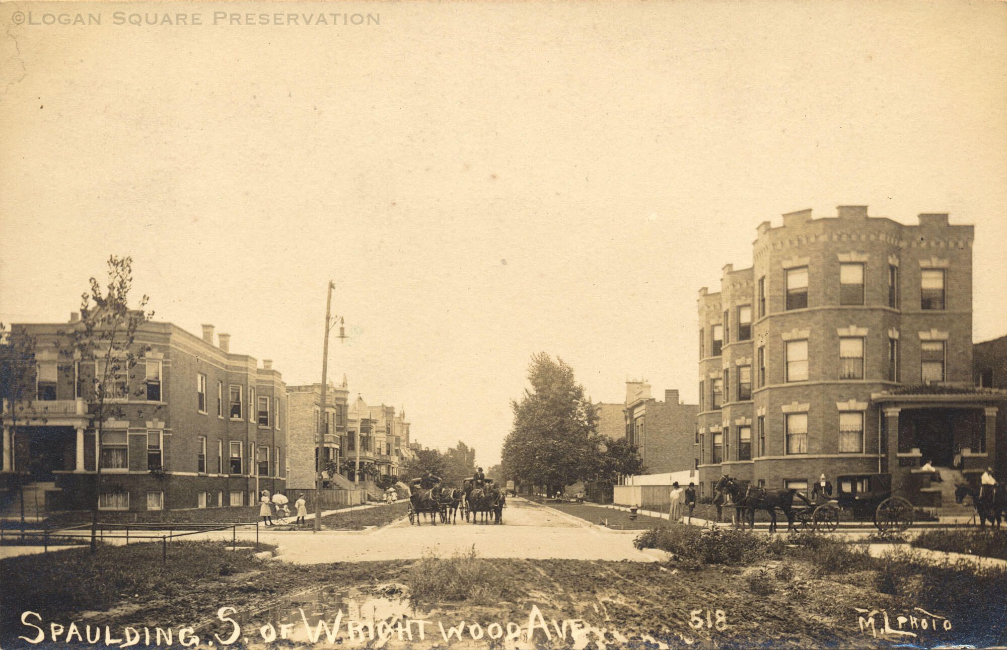 Real-photo postcard view looking down muddy Spaulding at horse-drawn wagons and pedestrians at intersection of Wrightwood & Spaulding Aves, circa 1911Subject