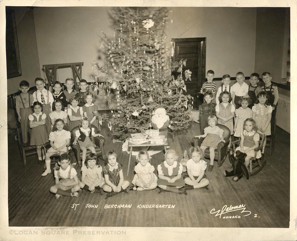 School portrait of kindergarten class at St. John Berchman school gathered around tinsel-decorated Christmas tree and table of gifts with Santa Claus figure, circa 1940sPhotograph Details