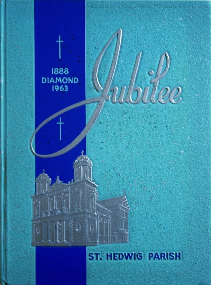 192-pg yearbook commemorating 75th anniversary of St. Hedwig church, with history of congregation in Polish and English, photos of church groups and school classes, local business adsDimensions