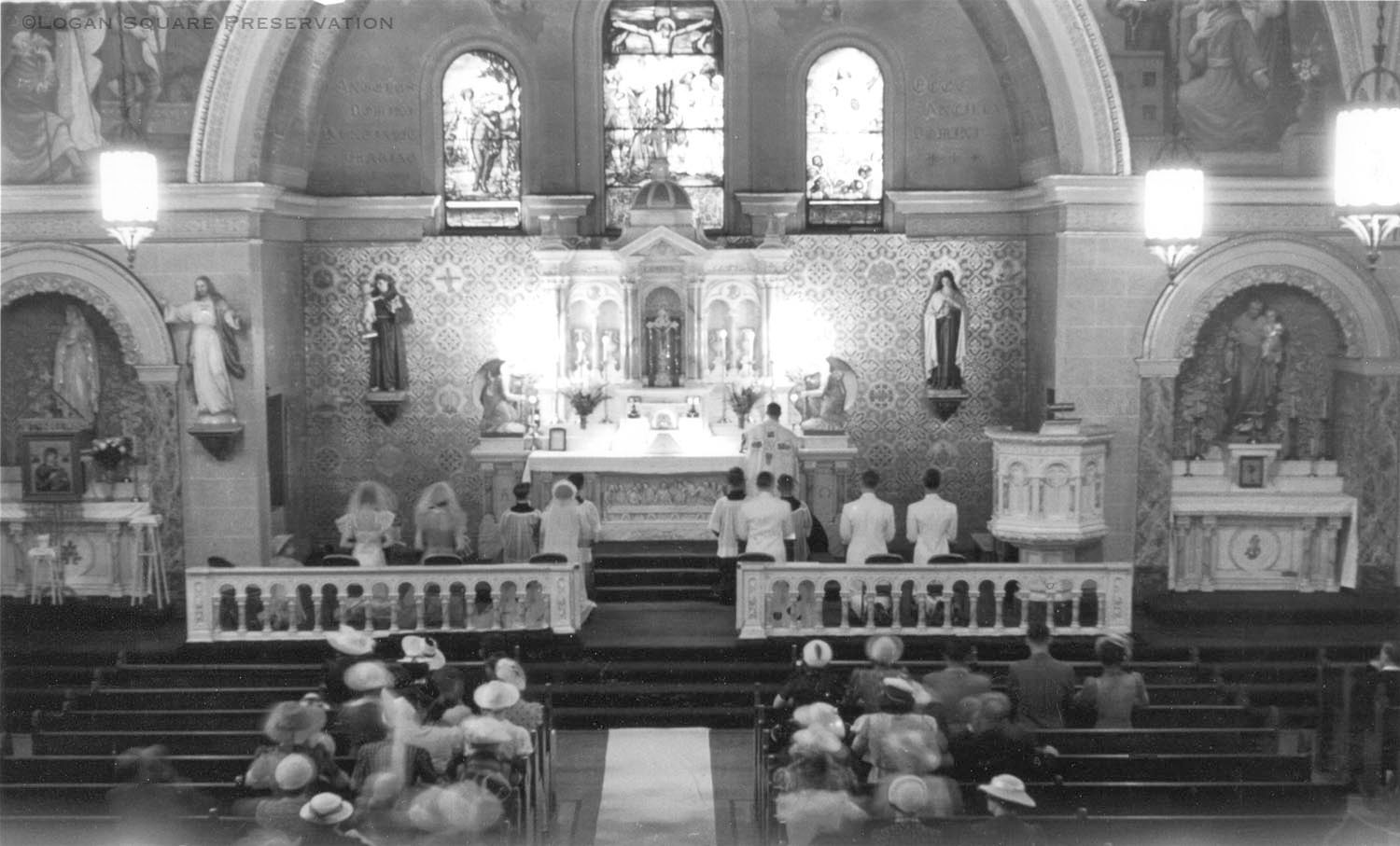 View looking down from balcony at wedding party facing altar to pray in sanctuary of St. John Berchmanns, circa 1940sPhotograph Details