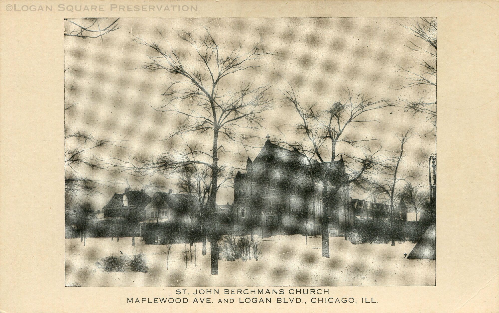 Printed halftone postcard view looking southeast across snowy Logan Boulevard at front of St. John Berchmans Church in winter, circa 1910Subject Person/Organization