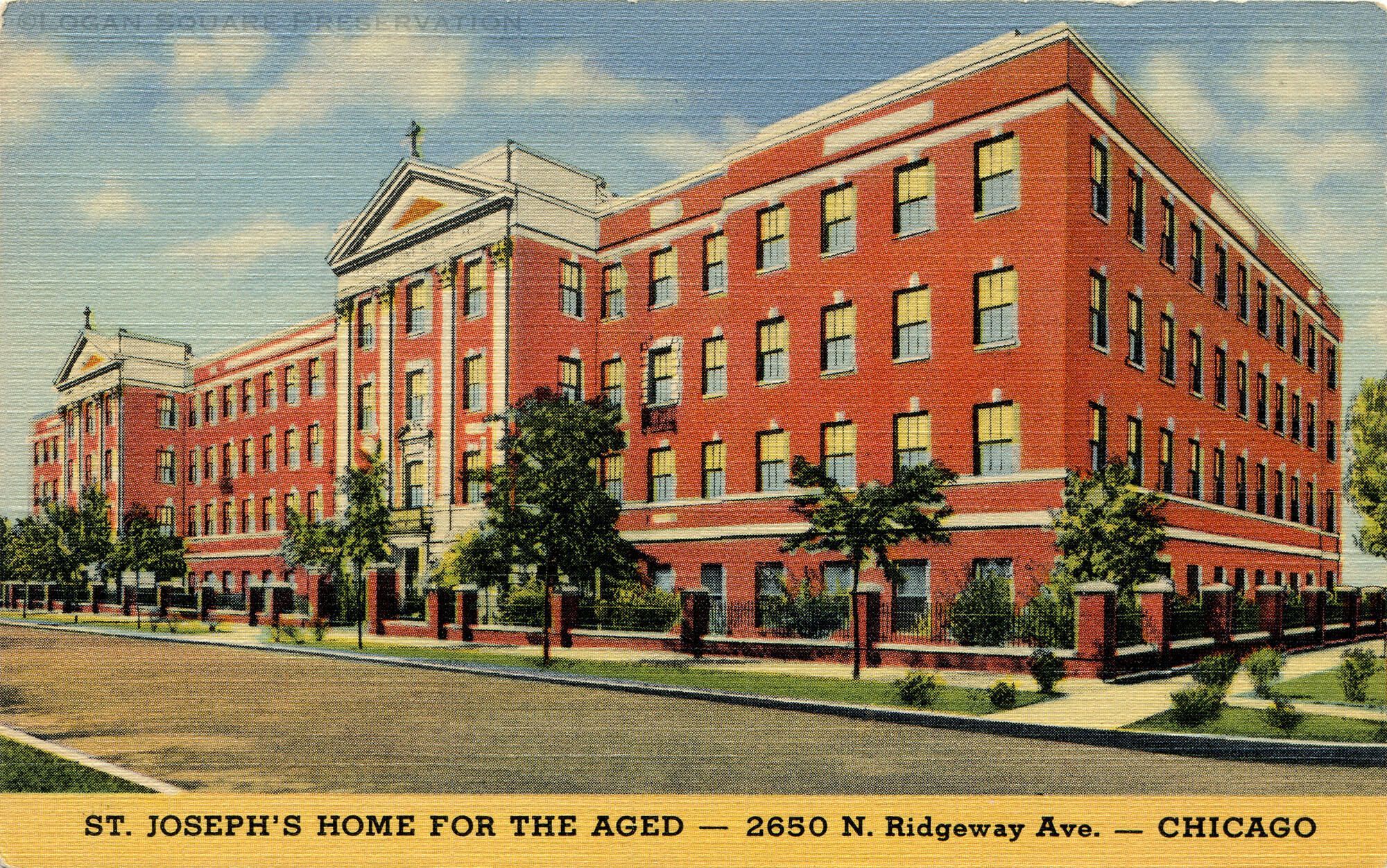 Colorized linen postcard view looking southwest at 4-story brick St. Joseph's Home for the Aged. Curt Teich postcard #1B-H1533Subject