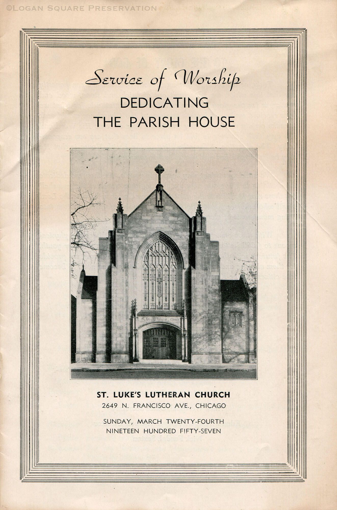 8-pg worship program for service and procession to dedicate new Parish House at St. Luke's Lutheran Church, Mar 24, 1957. Photo of west facade of 1925 church building on cover.Publication Details