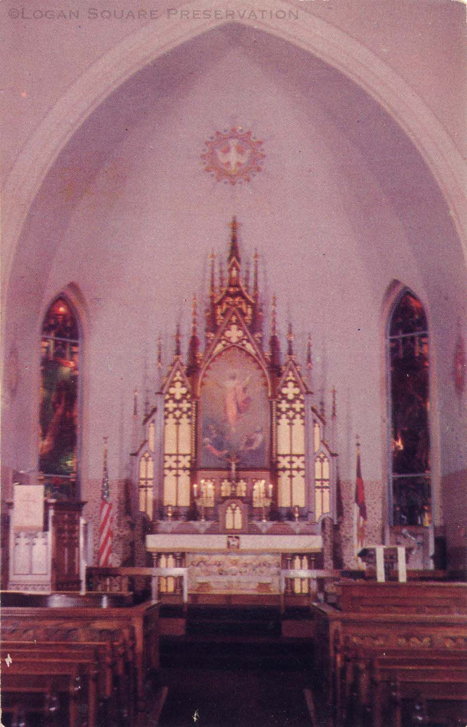 Chrome postcard view down aisle past pews to chancel with stained-glass windows and Gothic wooden altar at St. Simons Evangelical Church, circa 1960sSubject Person/Organization
