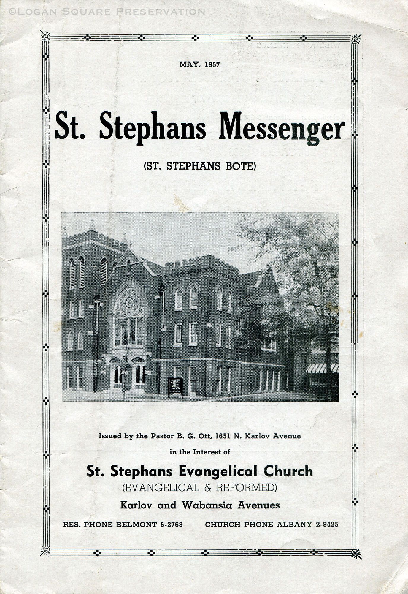 12-page monthly newsletter of St. Stephans Evangelical Church with photo of church on cover and local business ads, May 1957Publication Details