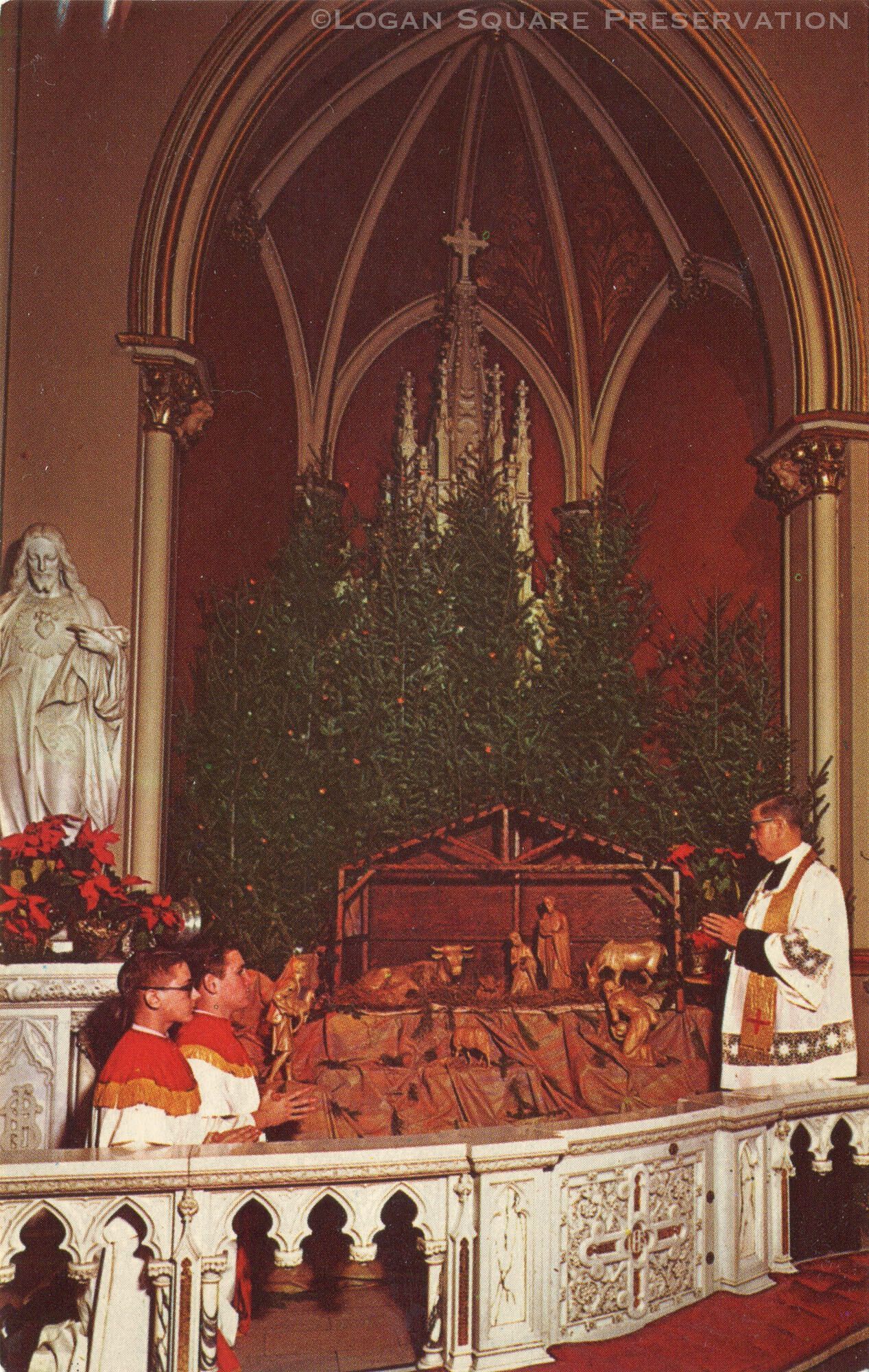 Chrome postcard view of altar boys and priest near miniature wooden nativity scene in church decorated with Christmas trees and poinsettias, 1964Subject Person/Organization