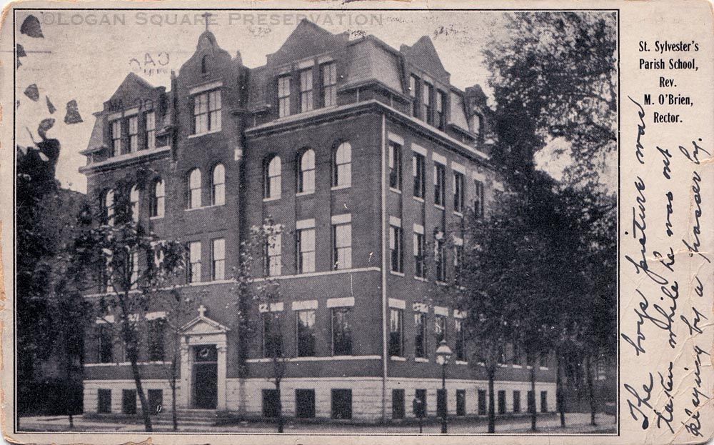 Halftone photo postcard view of northeast corner of no-longer-extant St. Sylvester School building mailed Jun 18, 1912 to Mrs. Terrance GuthrieSubject Person/Organization