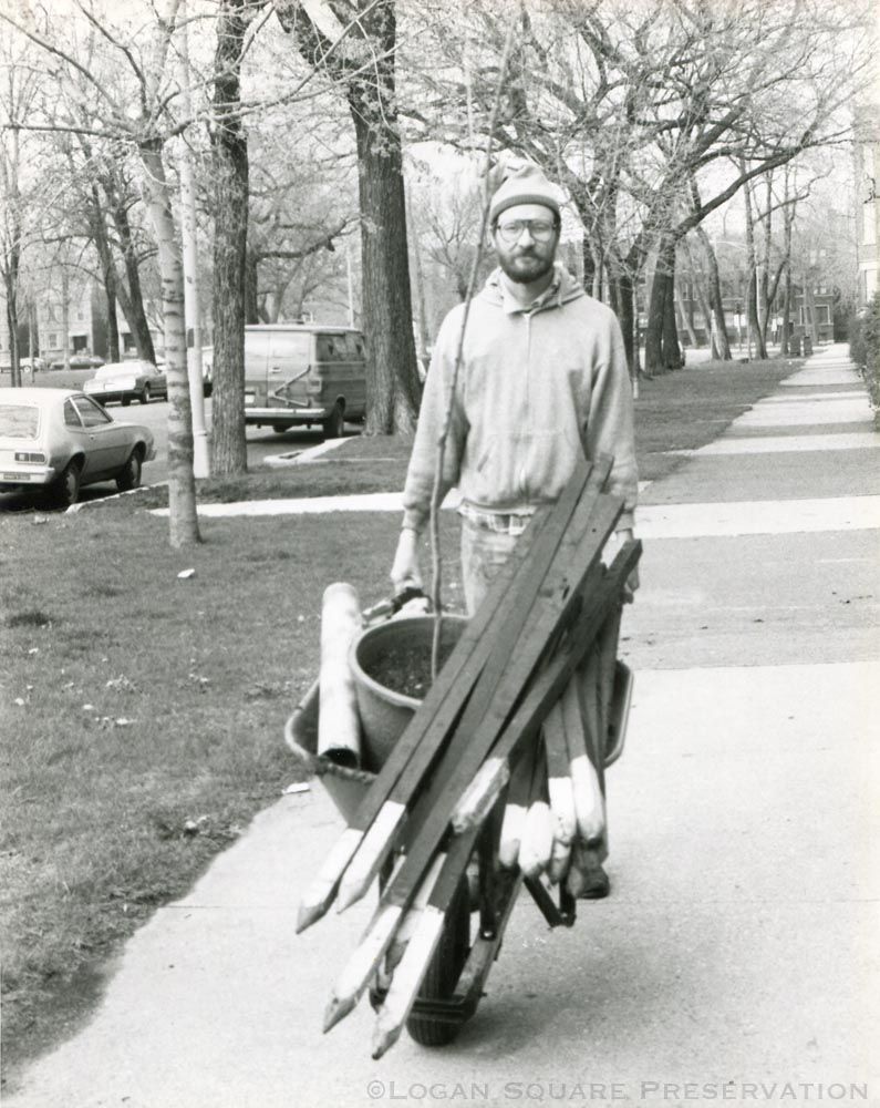 Photo of Steve Hier pushing wheelbarrow with potted tree sapling and wooden stakes on sidewalk on north side of Palmer Square, circa 1980s-1990sPhotograph Details