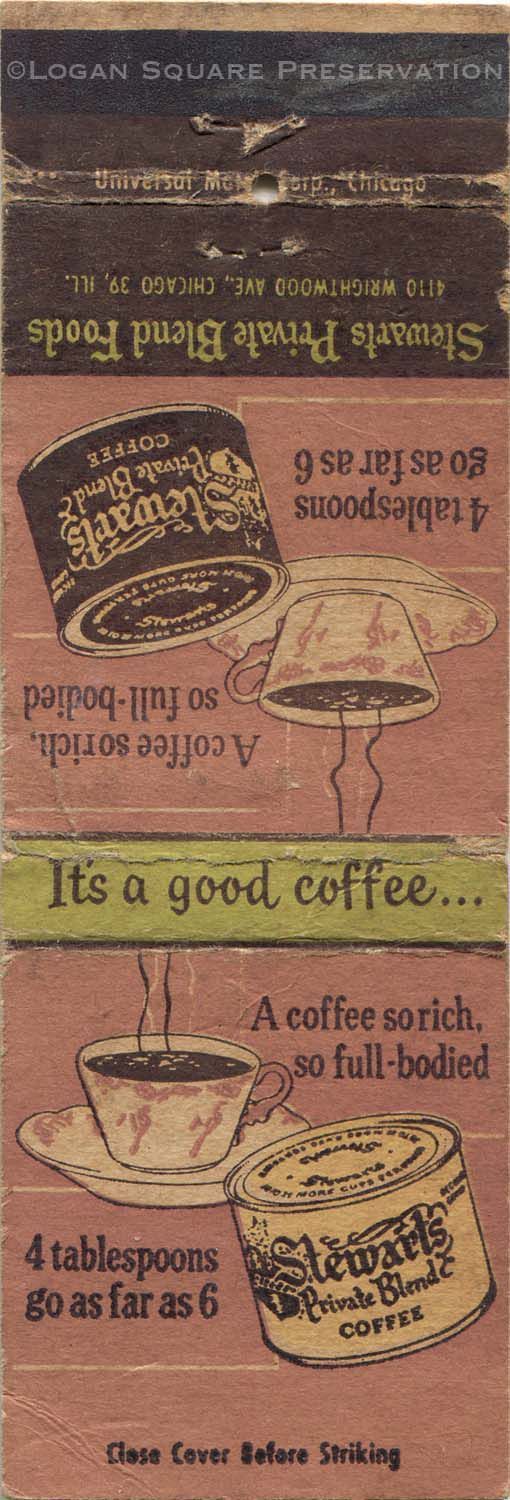 1.5" matchbook with illustration of can of Stewarts Private Blend Coffee next to steaming coffee cup, circa 1940sPublication Details