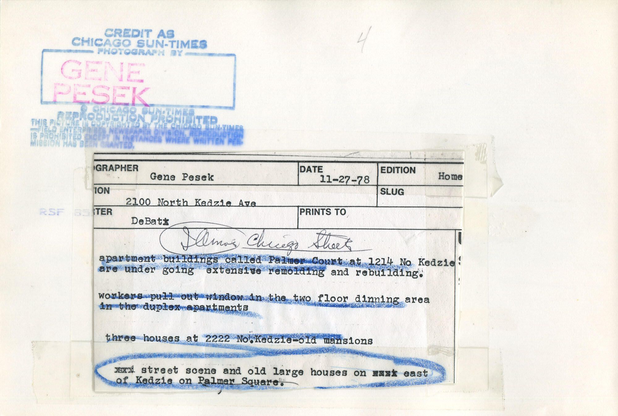 News photo of 3055-3071 W. Palmer (south side of Palmer Square) for Nov 27, 1978 Sun-Times article about building renovationsPhotograph Details