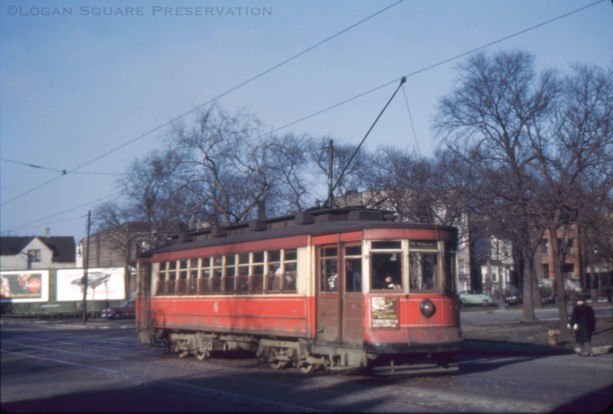 Slide transparency image looking northeast at southbound California Ave streetcar #322 crossing Logan Boulevard in late afternoon, Mar 23, 1953. Billboards for 1953 Chevrolet and Coca-Cola on empty lot at 2601 N California visible in distance. Slide duplicate printed 2006.Photograph Details