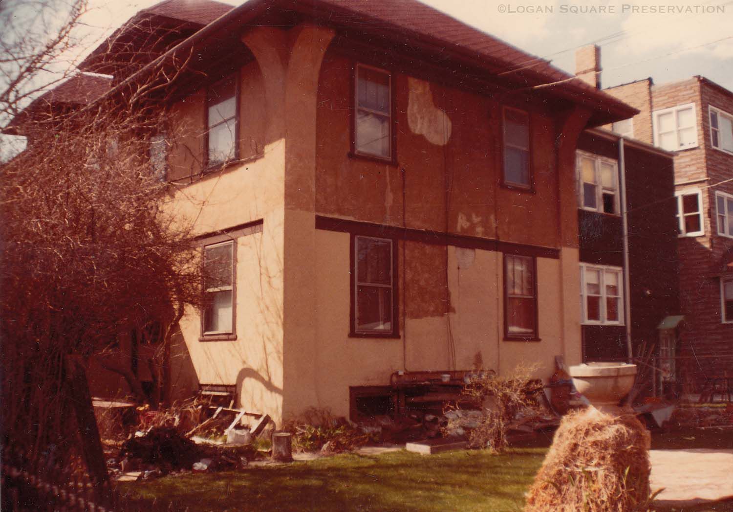 Snapshot photo of condition of east-facing stucco facade at 3230 W. Belden, April 1, 1982Photograph Details
