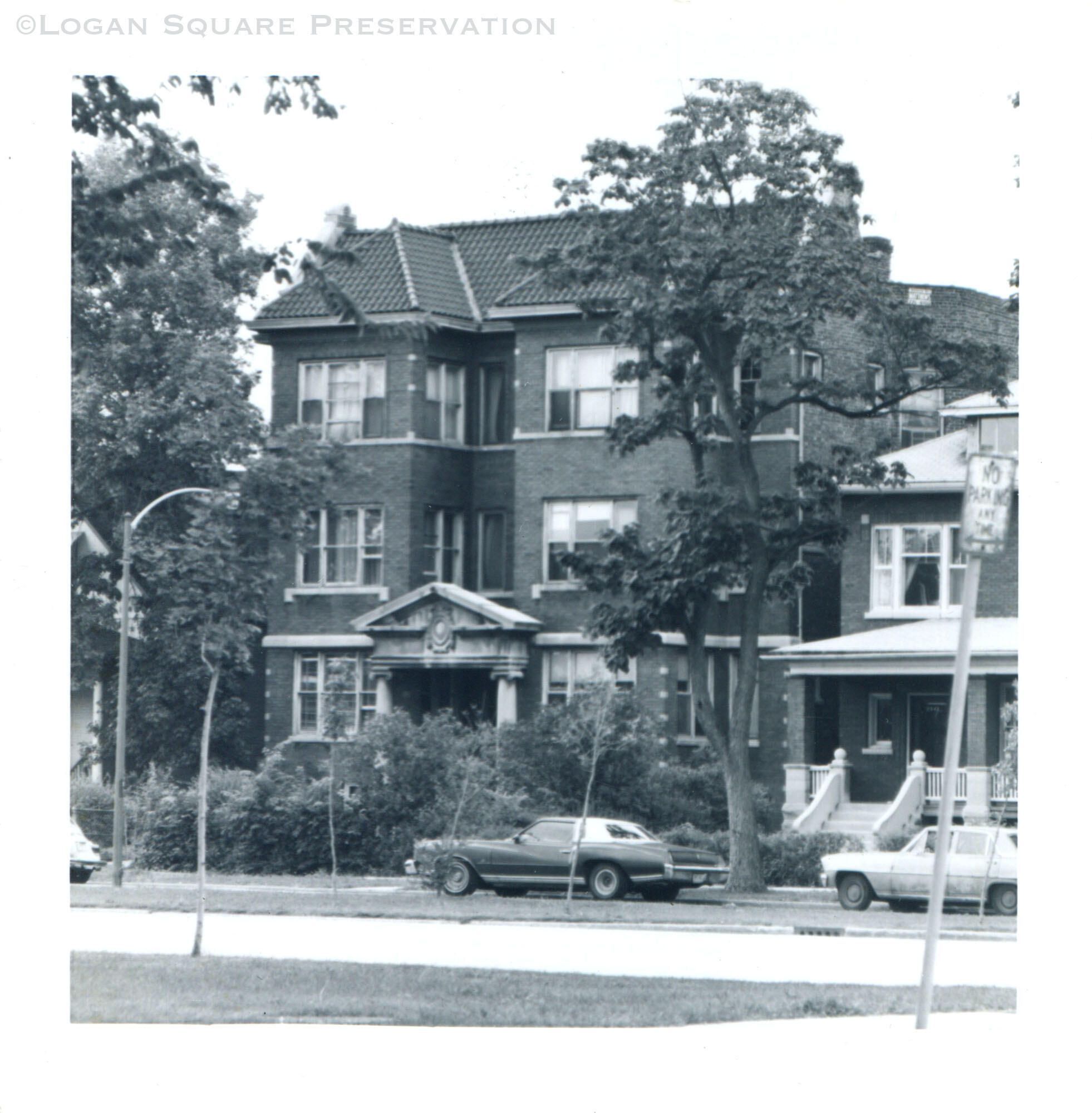 Photo view looking northwest across boulevard at front of brick 6-flat at 2546 W. Logan in summer, circa 1980sPhotograph Details