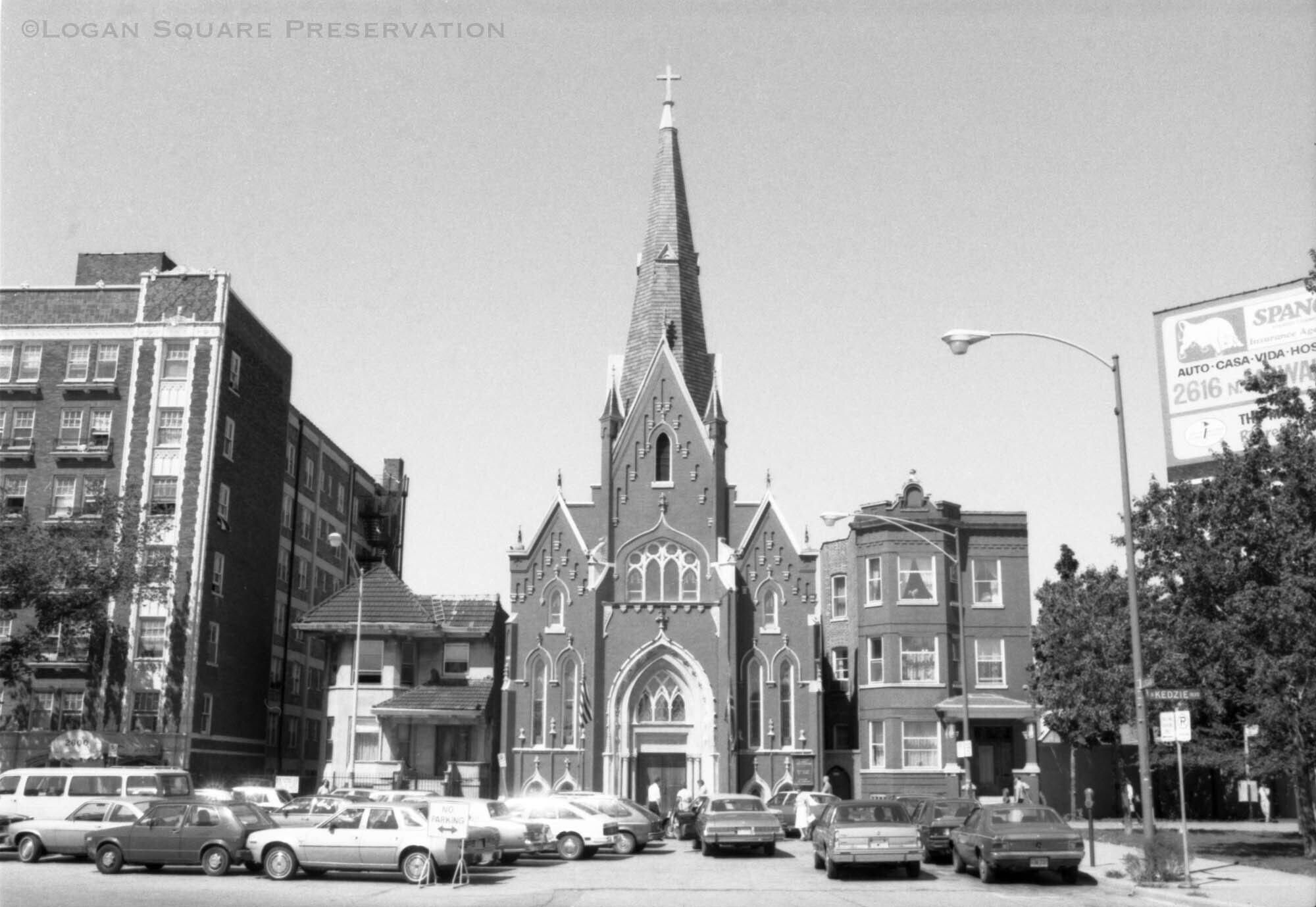News photo image looking west at Minnekirken and cars parked for Sunday church service, taken for Aug 13, 1985 Sun-Times article about new designation of Boulevard Historic DistrictPhotograph Details