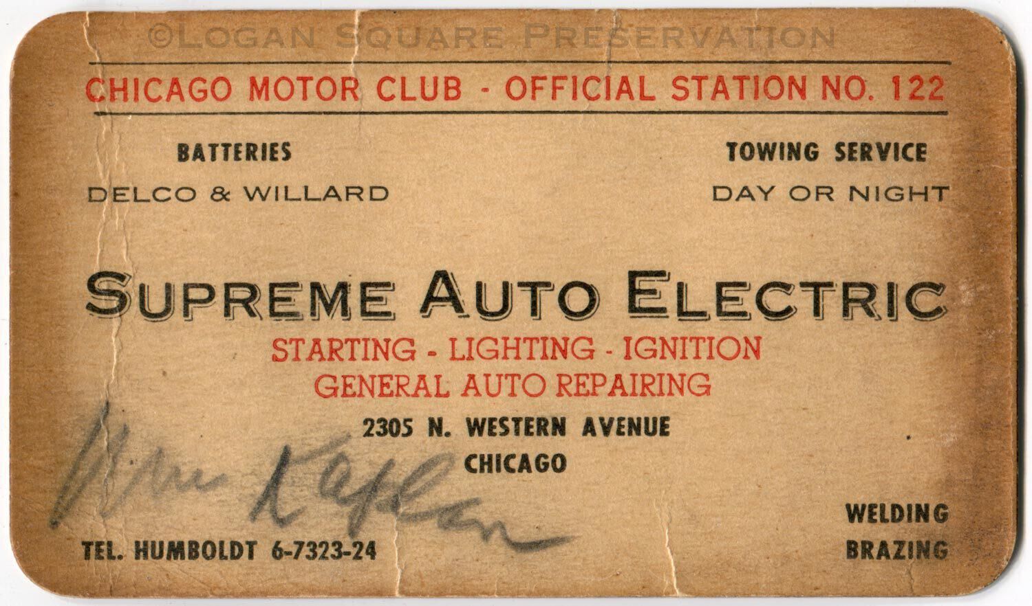 Business card in black and red ink with pencil signature of "Mr. Kaplan" written on card, circa 1940sDimensions