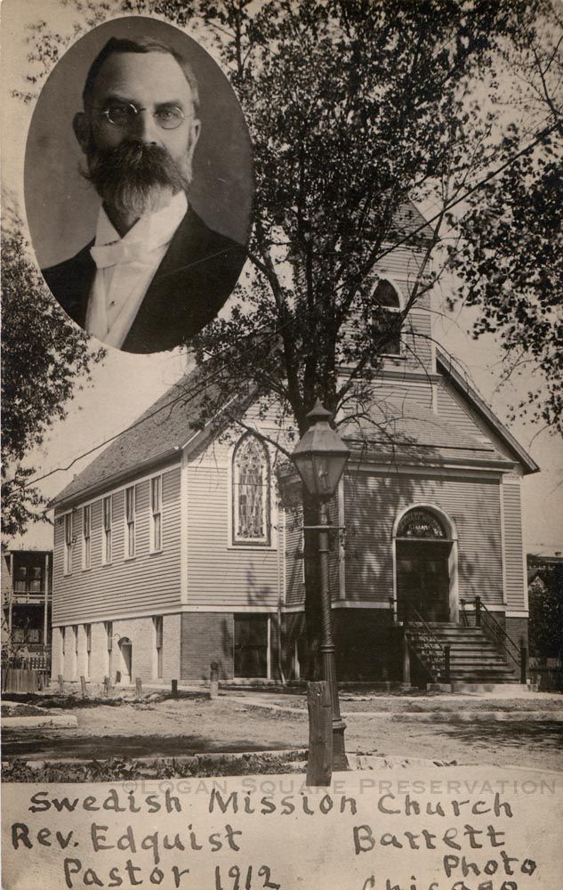 Real-photo postcard view looking northwest past gas lamp post at frame church next to unpaved alley, with inset photo of pastor Rev. Edquist, 1912Subject Person/Organization