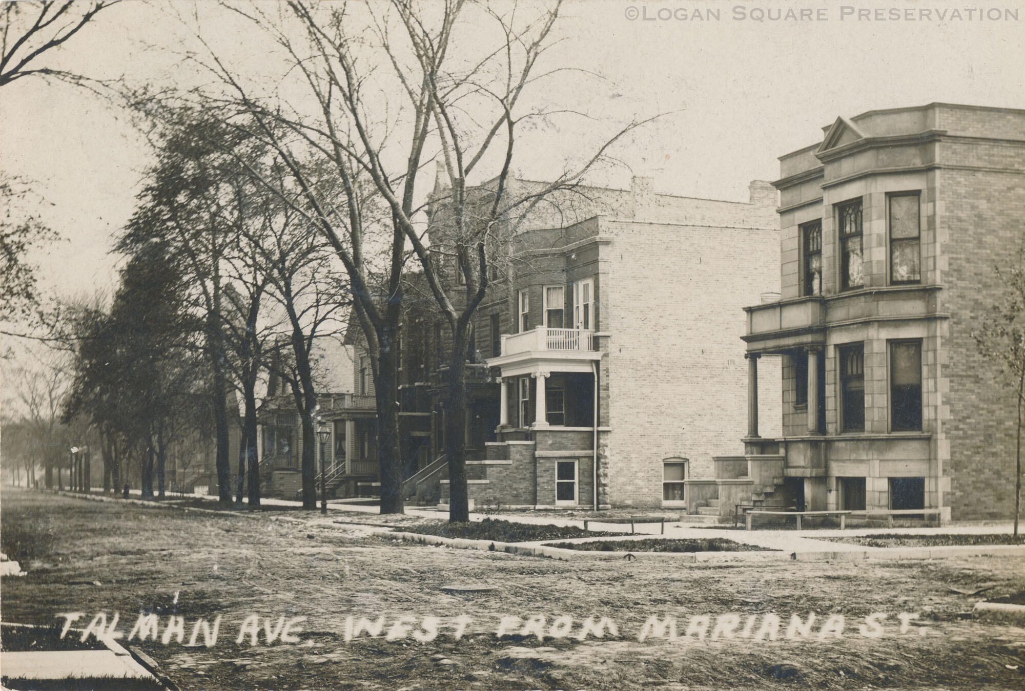Real-photo postcard view looking south from unpaved intersection of Schubert Ave (formerly Marianna St) and Talman Ave at houses and two-flats on west side of 2600 block of Talman, circa 1910Subject