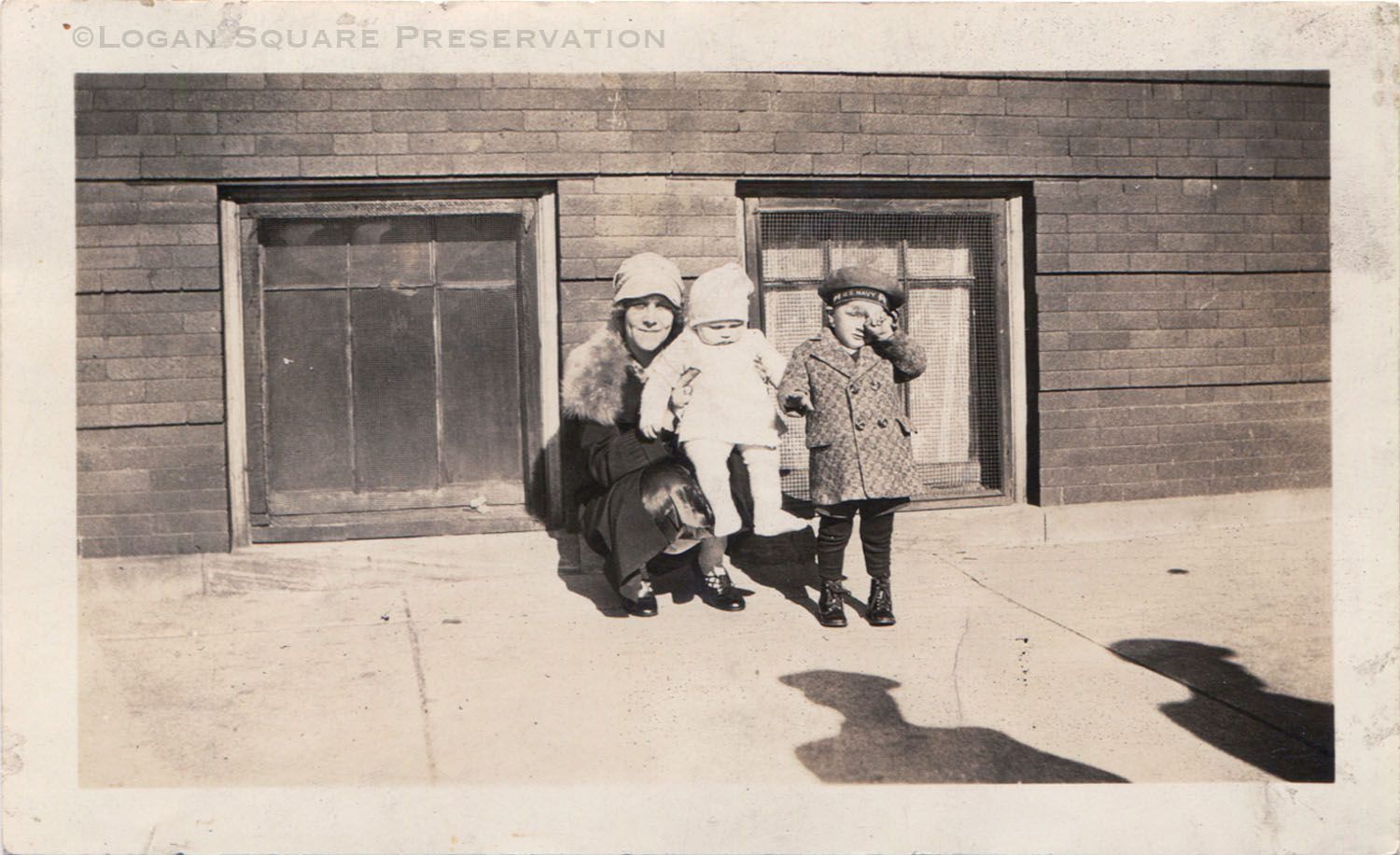 Snapshot photo of woman with Karl and Kermit Tangeros near basement windows of apartment at 2313 N. Albany, circa spring 1928Photograph Details