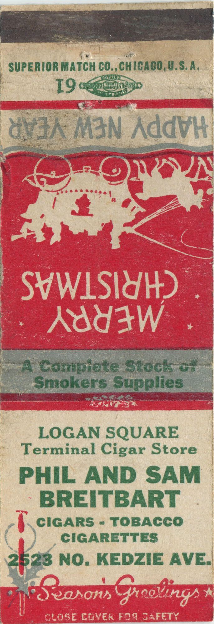 1.5" holiday-theme matchbook for Terminal Cigar Store, proprietors Phil & Sam Breitbart, with silhouette illustration of stagecoach on back: "Merry Christmas"Publication Details