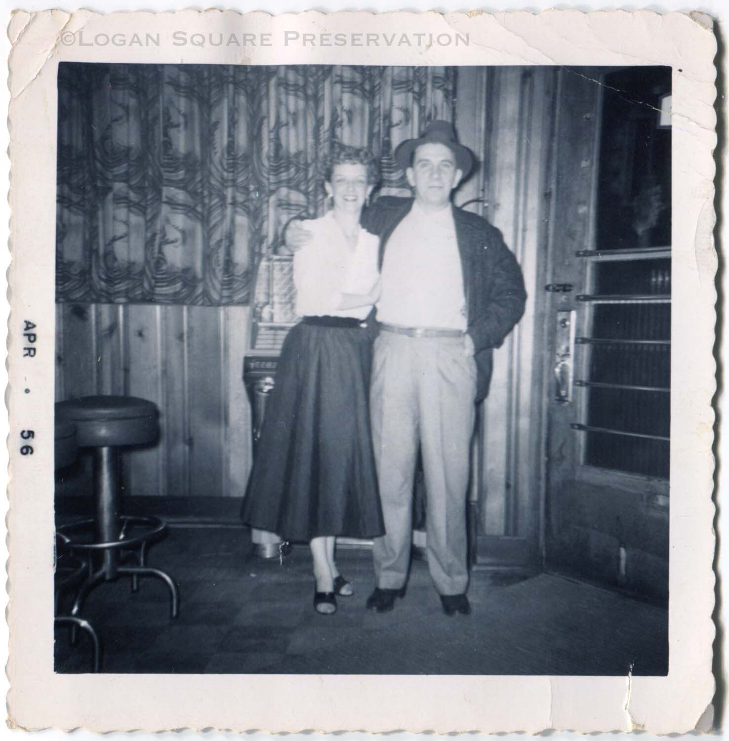 Snapshot photo of Bob Inn owner Terry Hanson with customer in front of jukebox, April 1956Photograph Details