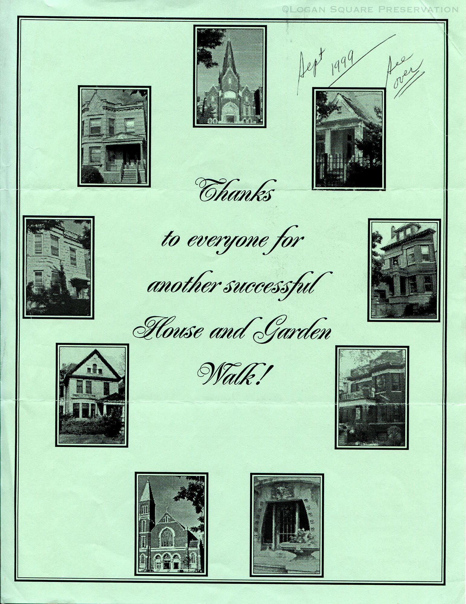 1-pg flyer on green paper listing participating homeowners and ticket receipts of 1999 House and Garden WalkPublication Details
