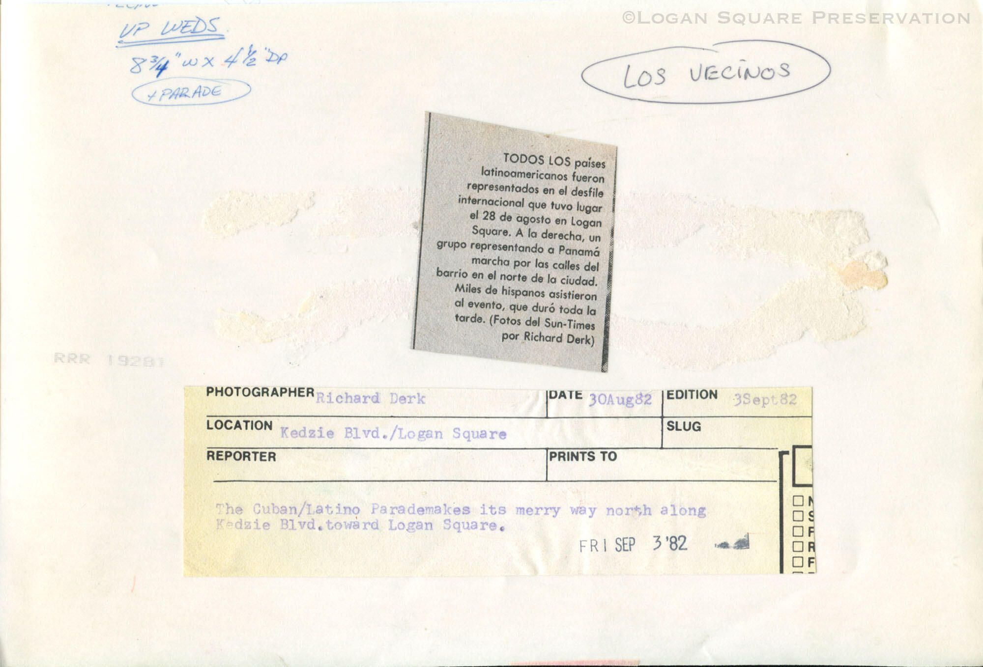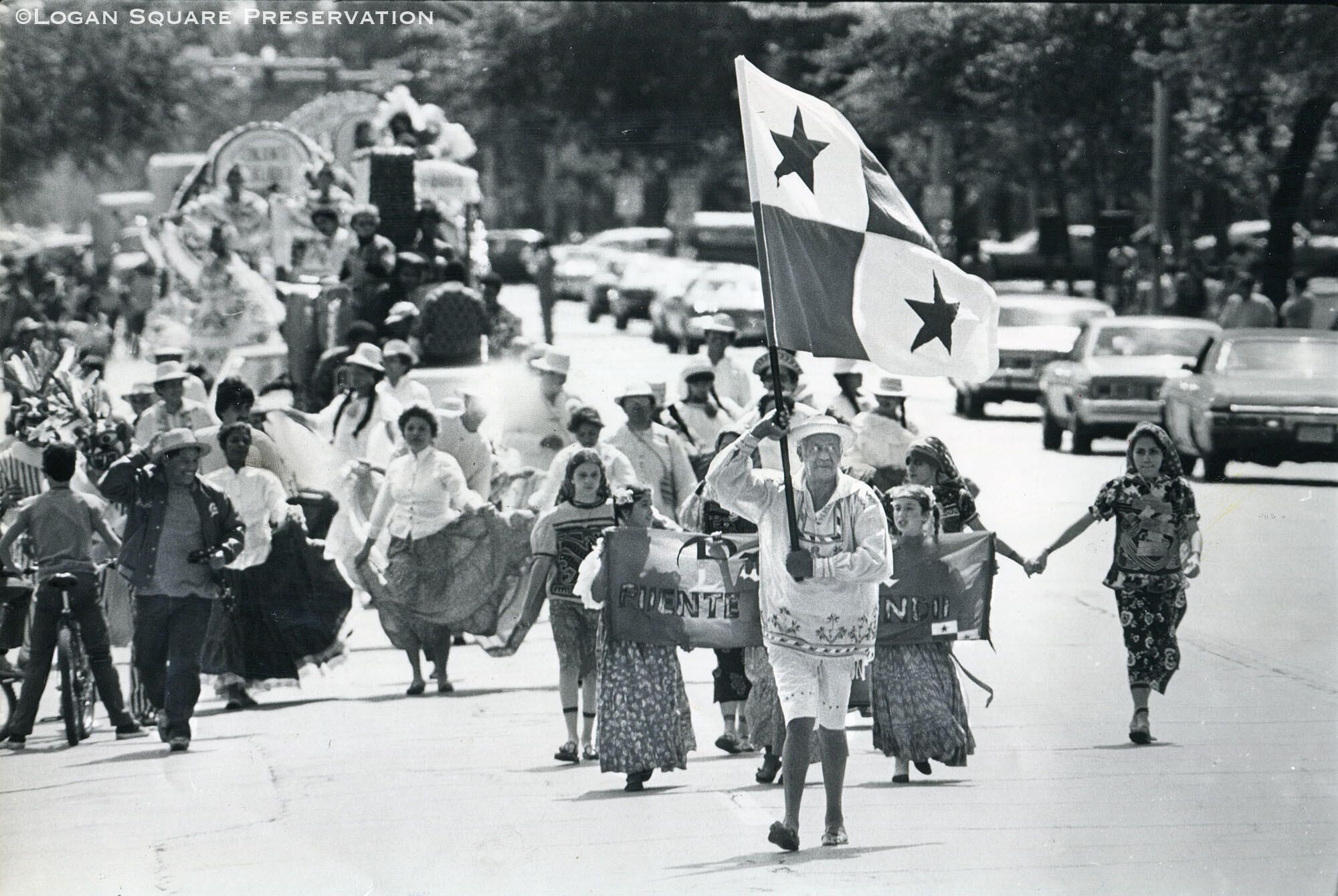 News photo image of man in montuno ocueño carrying Panama flag ahead of dancers and parade float in Cuban & Latin American parade marching on Humboldt Boulevard (mislabeled as Kedzie) north of Bloomingdale Line bridge, Aug 28, 1982Photograph Details