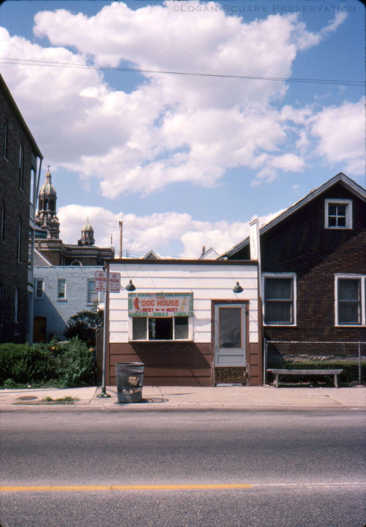 Slide transparency view of The Dog House hot dog stand attached to frame workers cottage on Diversey Ave sidewalk, with spires of St. Hyacinth Basilica in distance, July 1977Photograph Details