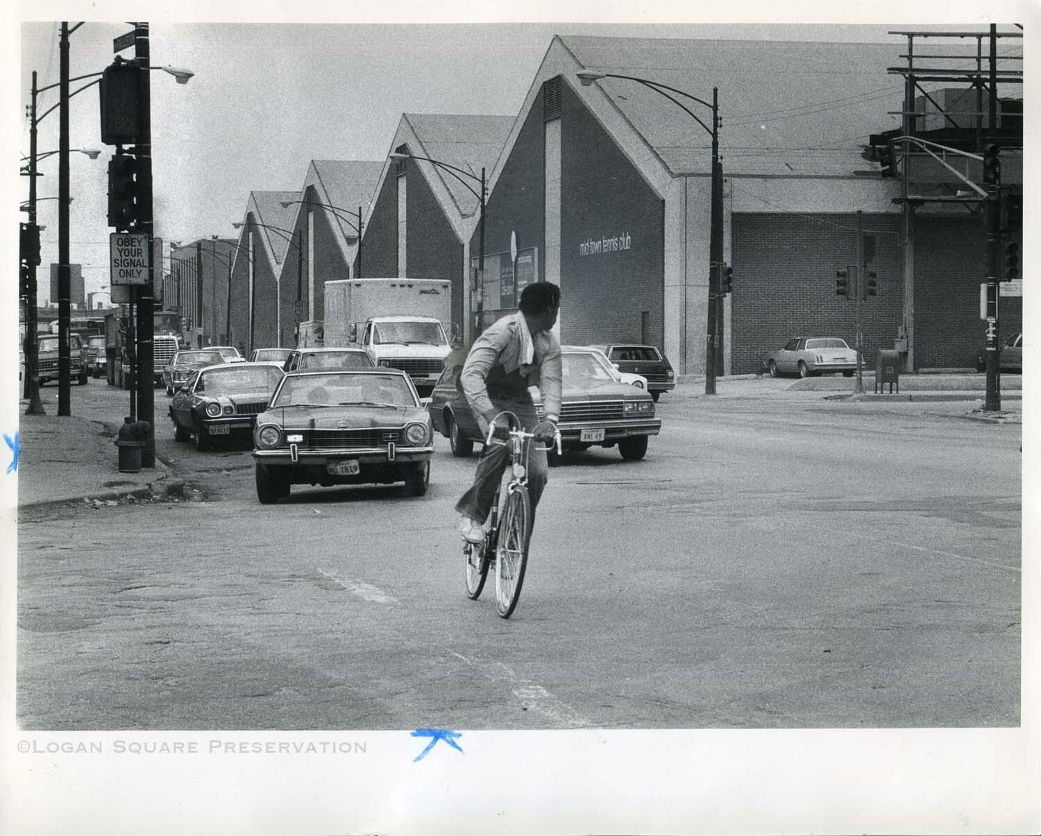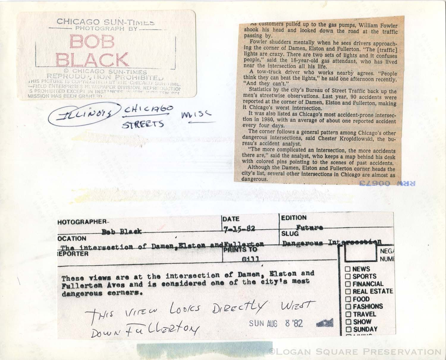 News photo looking west on Fullerton Ave at man riding bicycle looking over shoulder at eastbound auto traffic, July 1982Photograph Details