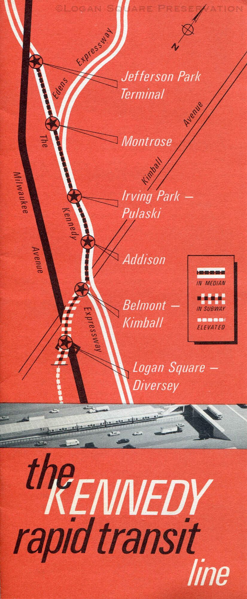 4-panel brochure in red and black ink with map of proposed L train (now Blue Line) extension from Logan Square to Jefferson Park, includes illustrations of proposed construction and map of Logan Square parking and bus re-routes during phases of construction, circa 1967Collection