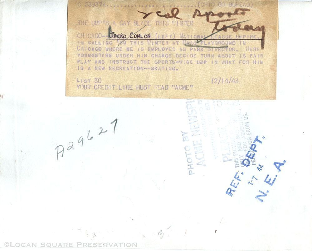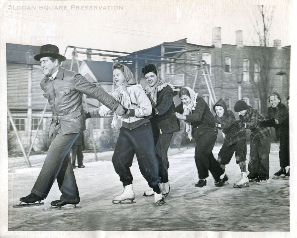 News photo of National League umpire and Haas Park director Jocko Conlon leading line of children skating across frozen playground, with swingset and apartment building in background, 1943Photograph Details