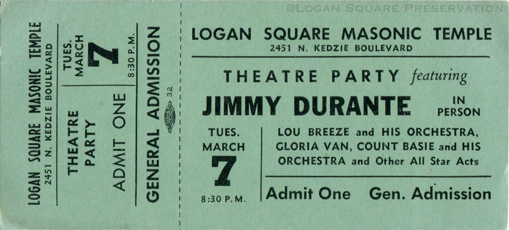 Unused general admission ticket from Mar 7, 1950 Theatre Party at Logan Square Masonic Temple featuring Jimmy Durante, Lou Breeze, Gloria Van, Count Basie and His OrchestraPublication Details