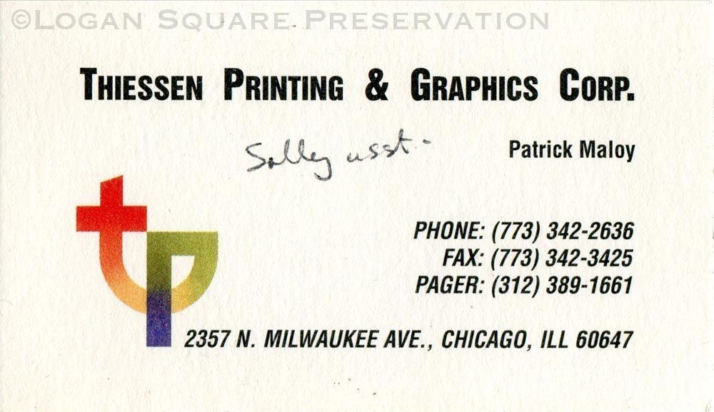 Business card printed on cream-colored paper for Patrick Maloy at Thiessen Printing & Graphics Corp, circa 1990sCollection