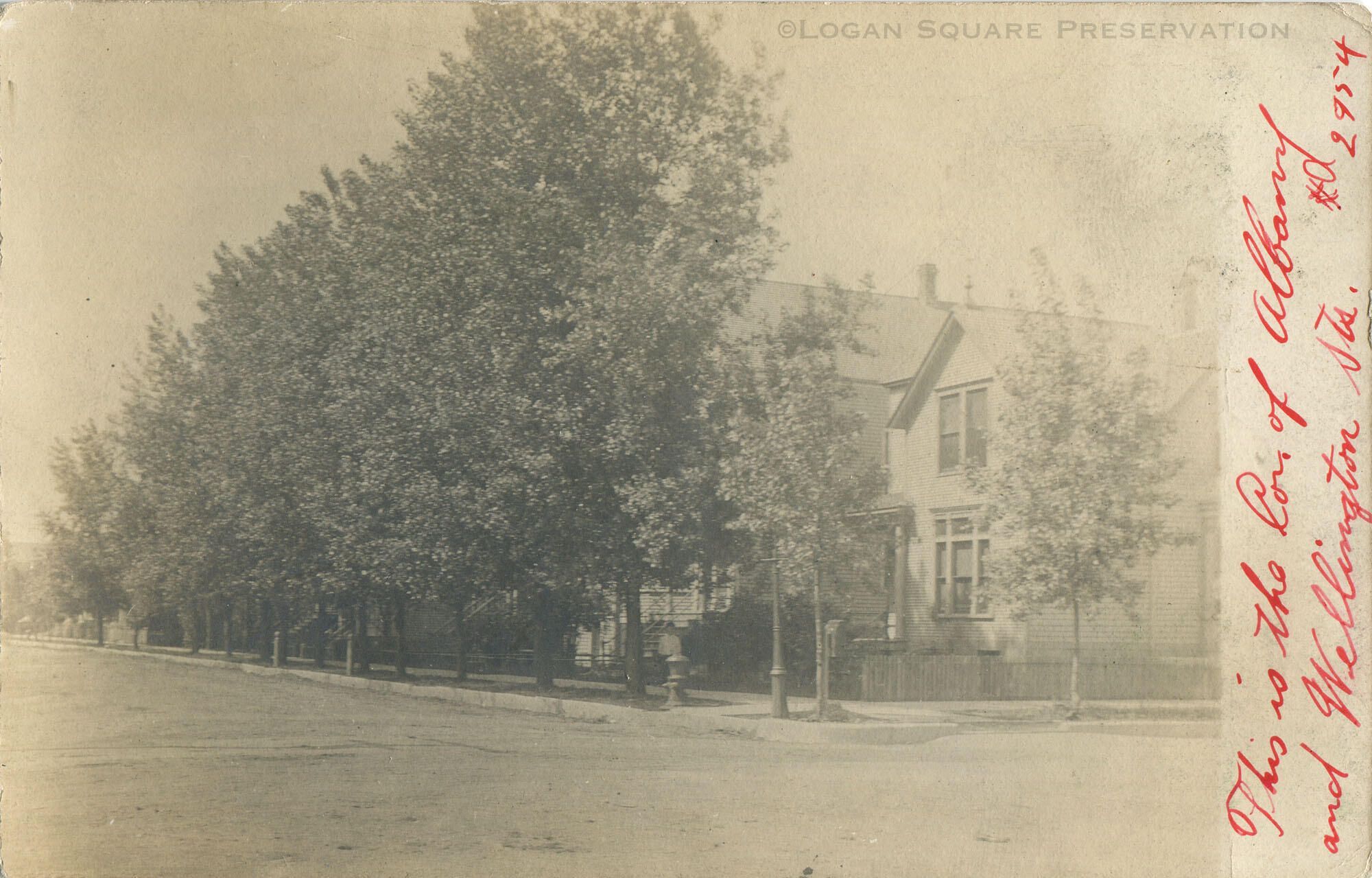 Real-photo postcard view looking southwest at row of trees on 2900 block of N. Albany Ave and no-longer-extant frame house at corner of Wellington, circa 1910Subject Place