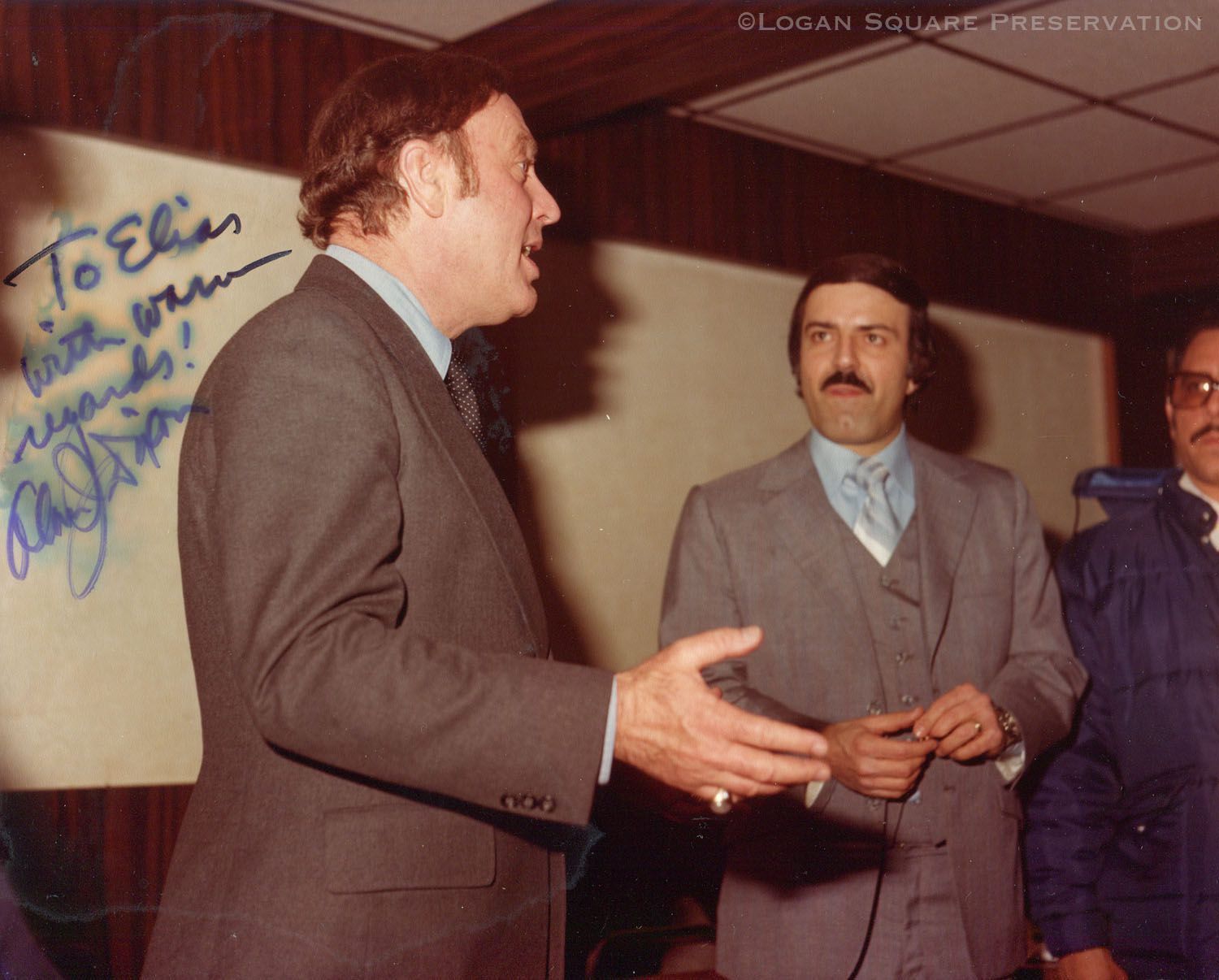 Portrait of Tania's Restaurant owner Elias Sanchez listening to U.S. Senator Alan Dixon speaking, signed in blue pen by Alan J. Dixon, circa 1981-1983Photograph Details