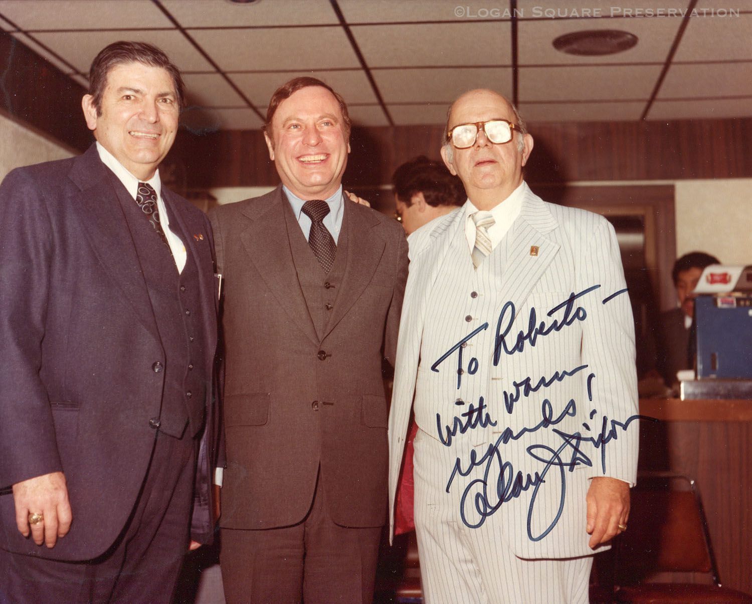 Portrait of U.S. Senator Alan Dixon in center of group of three men standing in Tania's Restaurant, signed in black pen by Alan J. Dixon, circa 1981-1983Photograph Details