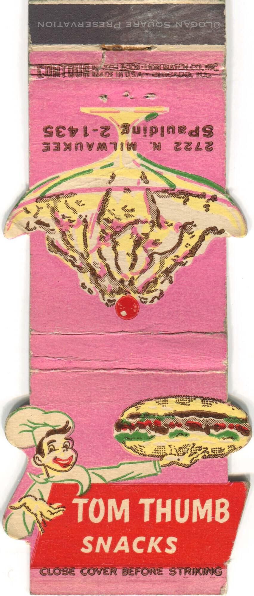 1.5" matchbook printed in pink, green, brown and yellow ink on cream die-cut paper with oversized illustration of banana split and Tom Thumb character holding sandwich, circa 1952-1953Publication Details