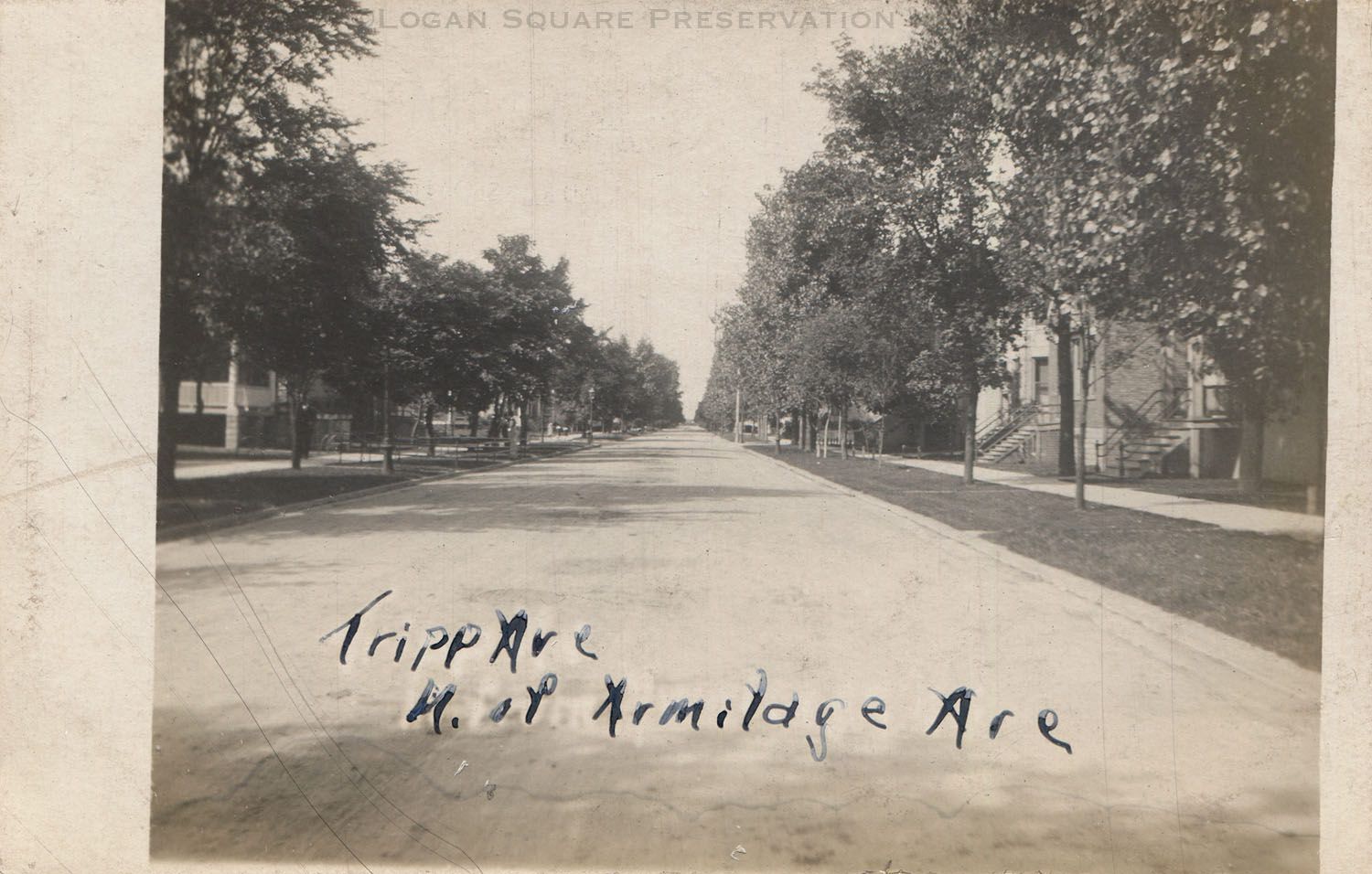 Real-photo postcard view looking north at two-flats behind trees on 2000 N. block of Tripp Ave, circa 1910Subject Place