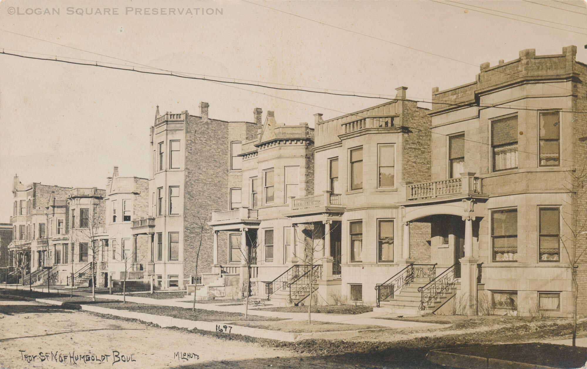Real-photo postcard view looking northeast at row of greystones on east side of 2600 block of Troy St., circa 1908Subject