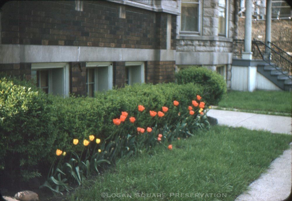 35mm color Kodachrome slide transparency view of tulips blooming in front yard of 2532 N. Richmond on Mothers Day, 1959Photograph Details