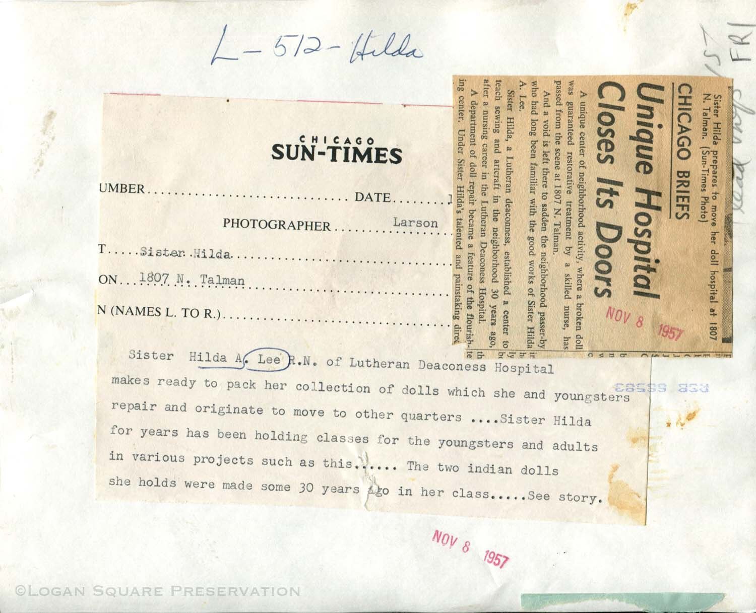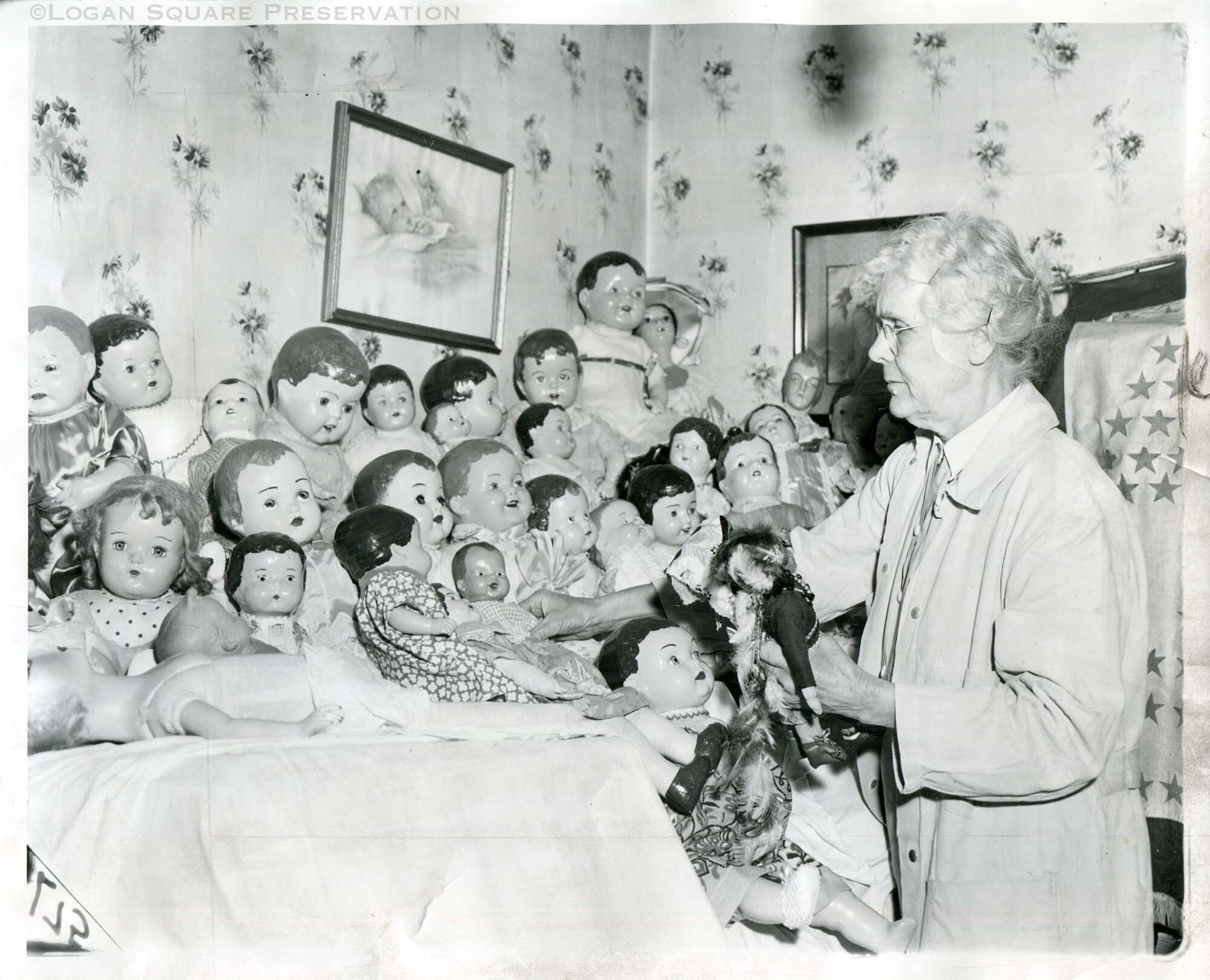 News photo portrait of Sister Hilda A. Lee packing her collection of dolls in preparation for closing of doll hospital after 30 years, Nov 1957Photograph Details