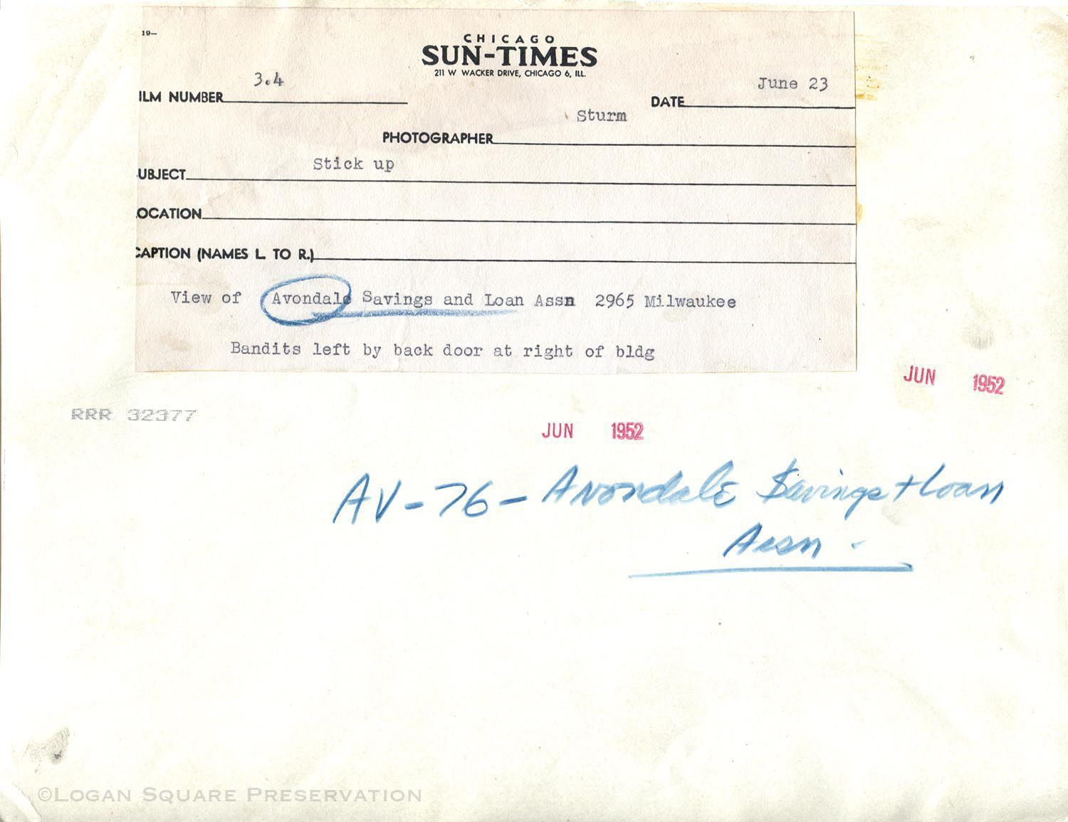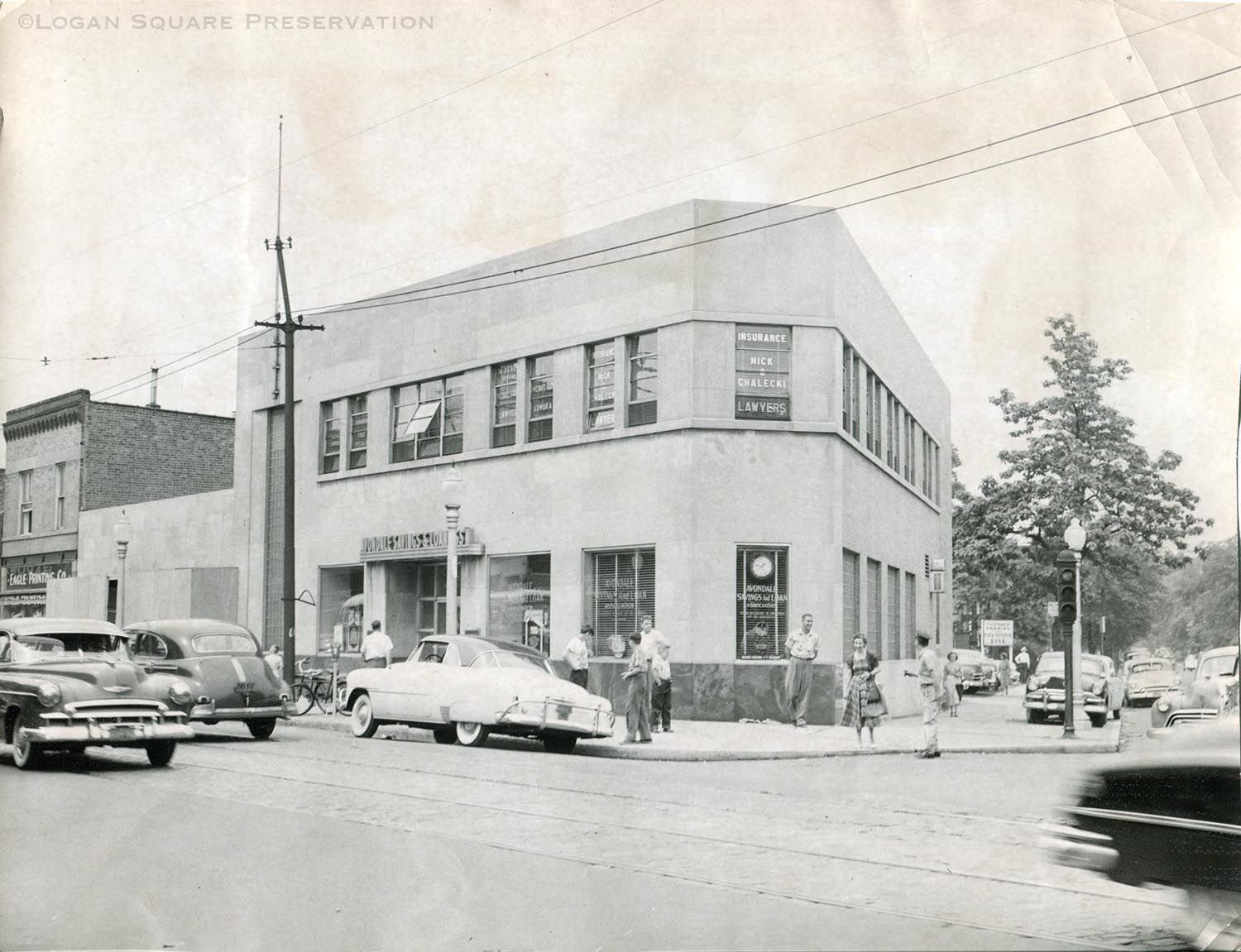 News photo of two-story art moderne bank building and Milwaukee Avenue traffic after three armed robbers in knit hoods and coveralls ordered bank employees and customers to the floor while they made off with $10,000 and escaped through the back door to a waiting automobile, June 23, 1952Photograph Details