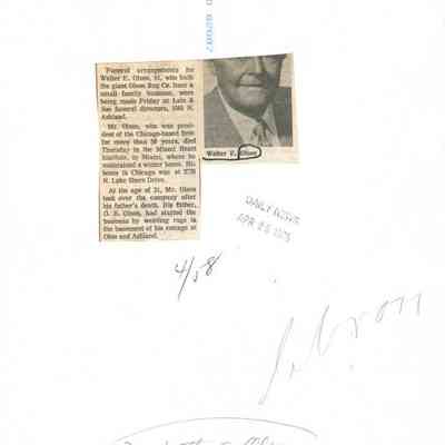 Studio portrait of Olson Rug Company president Walter E. Olson sitting in chair holding glasses, printed with April 25, 1975 obituary in Chicago Daily NewsPhotograph Details