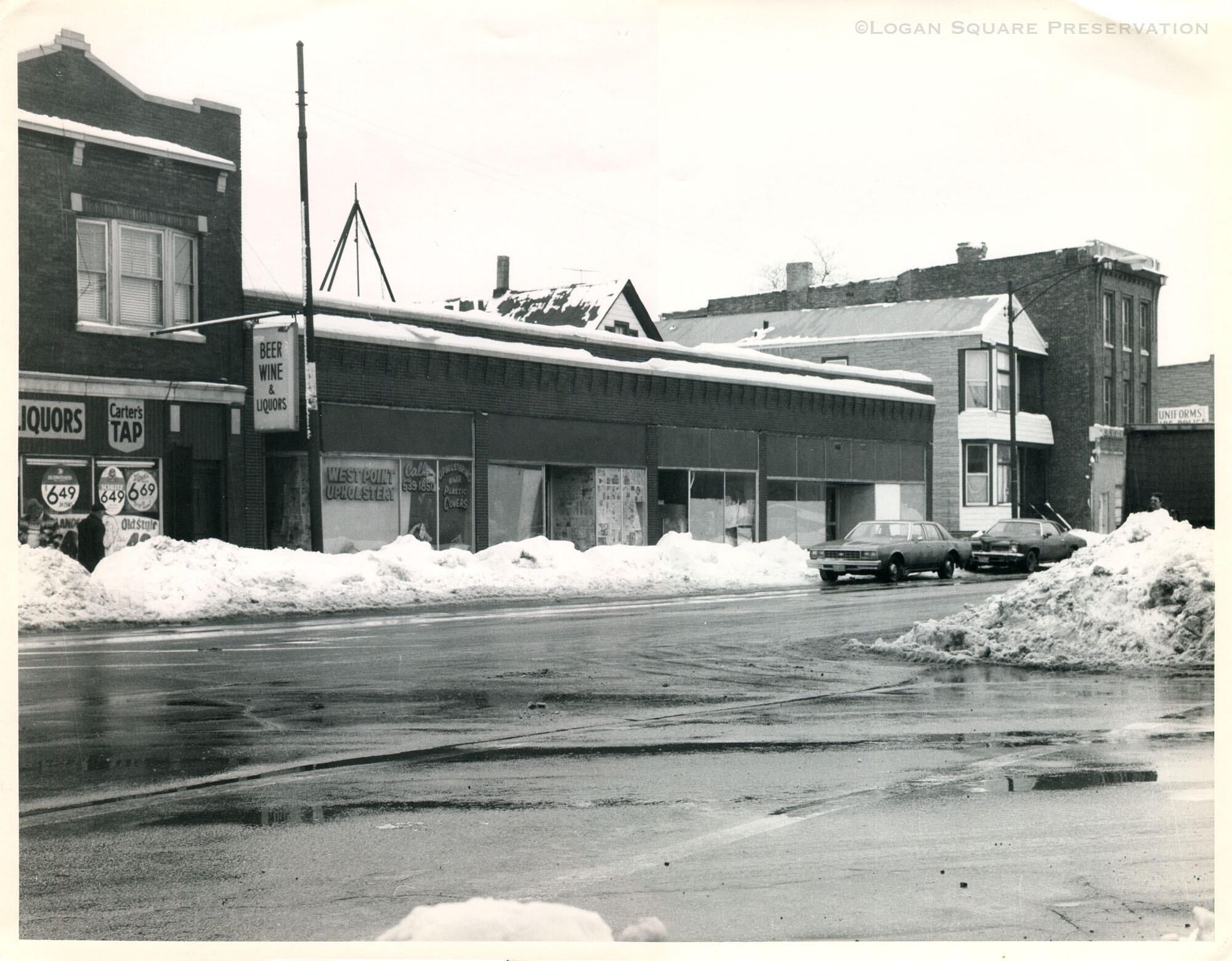 Oversized photograph view of snowbanks on Belmont Ave in front of brick commercial building and tavern, circa 1980Photograph Details