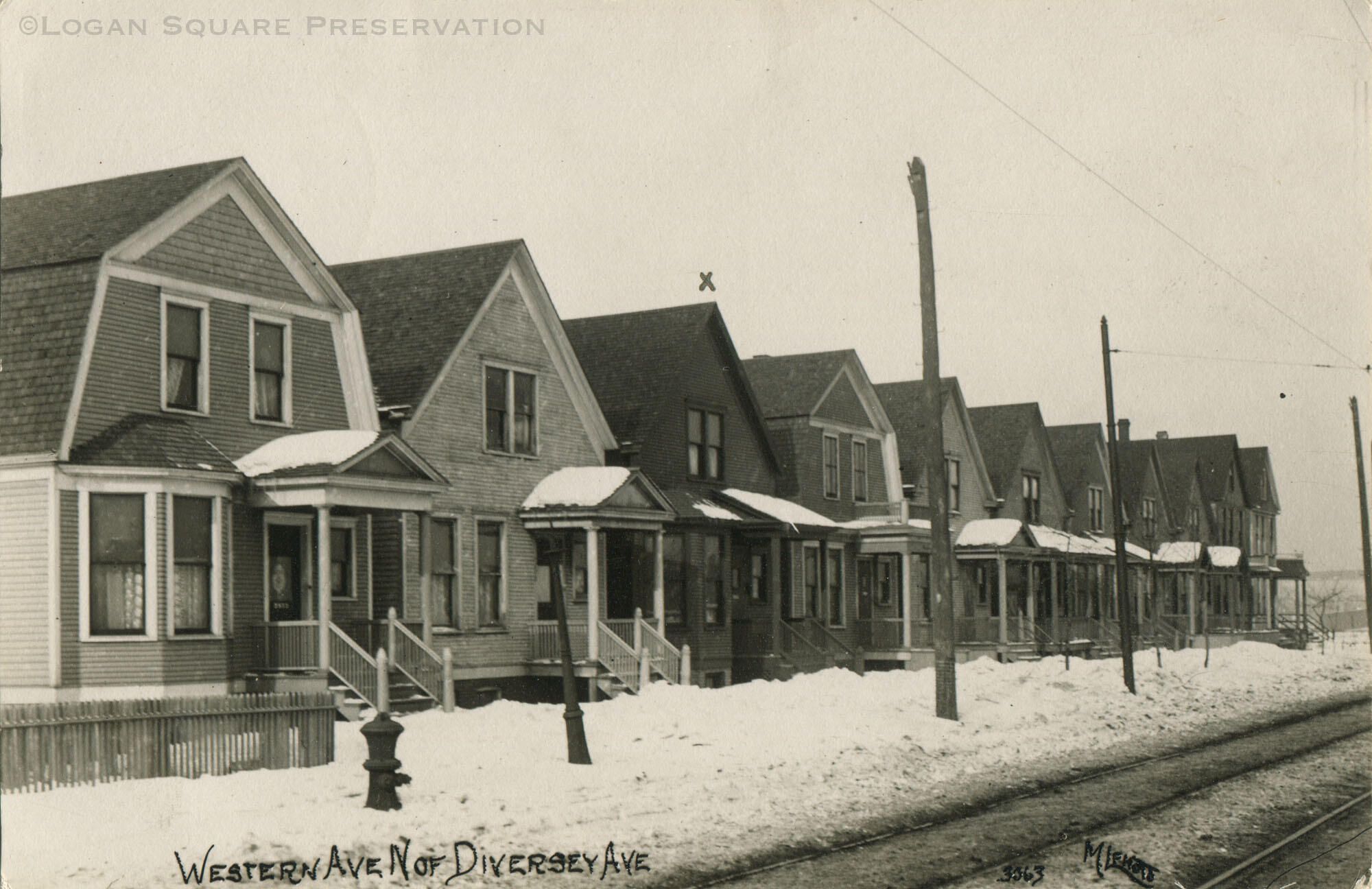 Real-photo postcard view of row of workers cottages on west side of 2800 block of N. Western Ave, circa 1910. House at 2838 N. Western marked with "X"Subject