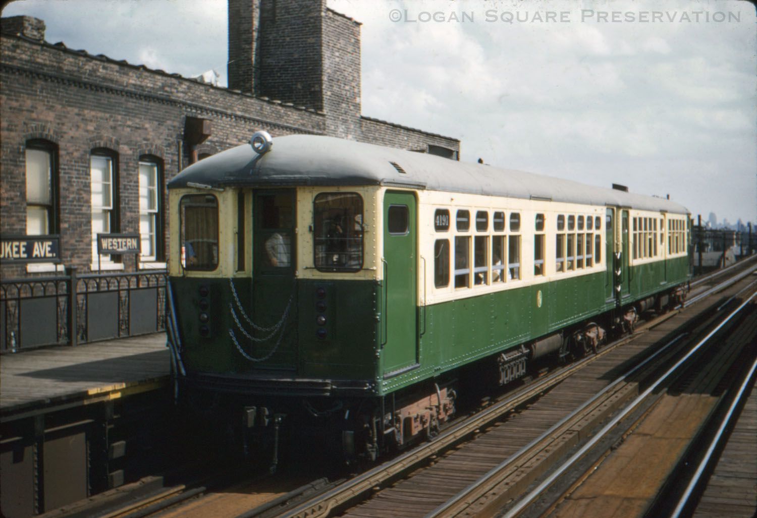 35mm Kodachrome color slide transparency view of CTA cars #4191-4192 next to north platform at Western Ave station with third floor of nearby buildings behind, taken September 14, 1958Photograph Details