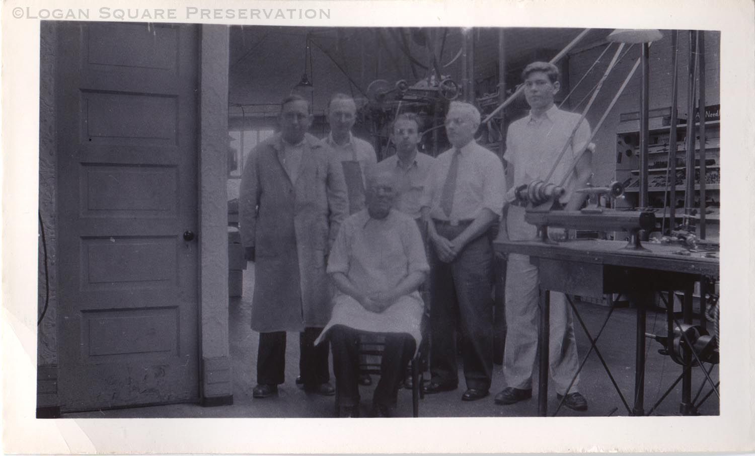 Snapshot portrait of Wold Air Brush Co. factory employees posing amid lathe work stations, labelled on back June 1937Photograph Details