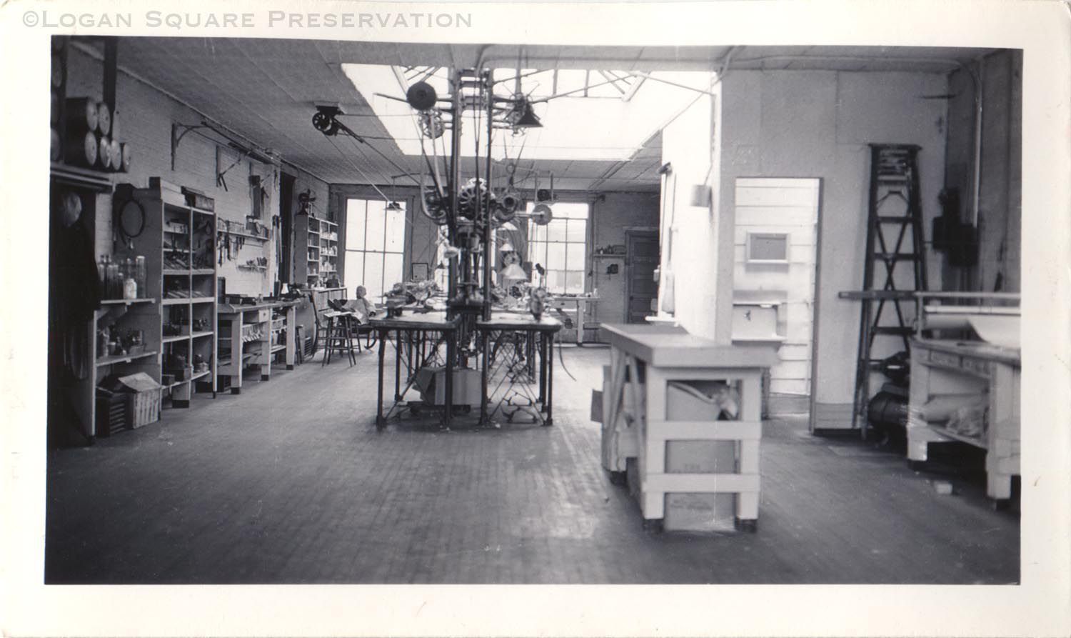 Snapshot view of Wold Air Brush Factory looking westward toward work tables and lathe work stations with man in distance sitting in rocking chair, labelled on back June 1937Photograph Details