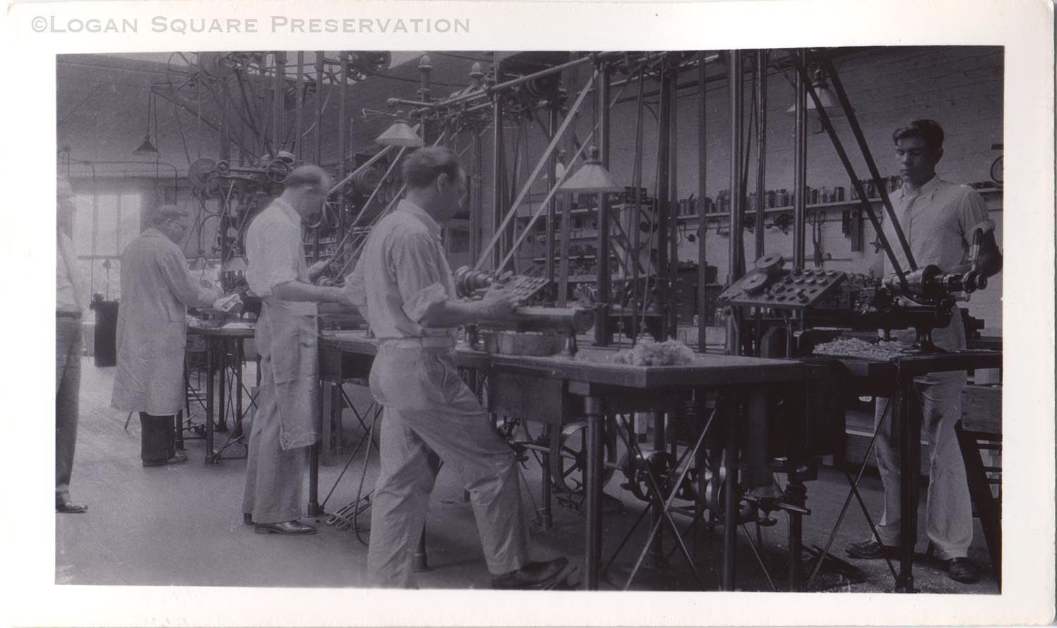 Snapshot view of Wold Air Brush factory employees standing at lathe work stations, labelled on back June 1937Photograph Details
